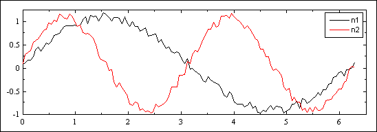 When we measure signals in a noisy environment and calculate correlations between the measured signals we must take into account the noise that we have in the system. In the following demonstration we measure three signals in a noisy environment. The noise consists of a low frequency sine wave with an additional small random noise. We define two noise signals, n1, and n2, where n2 has twice the frequency of n1. Figure 1 shows these signals: